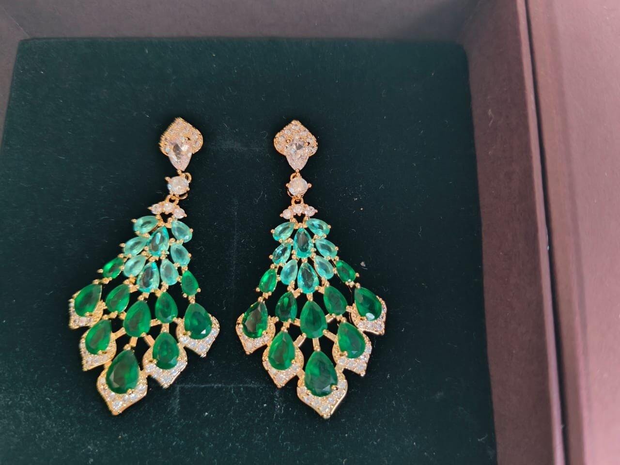 Dazzle in these ruby-pink chandelier earrings, crafted with teardrop stones on a gold-tone base with diamond accents — a perfect statement piece for weddings and parties.